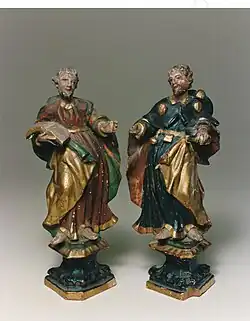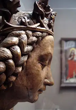 It is hard to compare the figure work of England with that on the Continent owing to the disastrous effect of the Reformation. But when we examine the roofs of the Eastern counties, the bench ends of Somerset, or the misericords in many parts of the country, we can appreciate how largely wood sculpture was used for purposes of decoration. If as a rule the figure work, was I not of a very high order, we have conspicuous exceptions in the stall elbows of Sherborne, and the pulpit of Trull, Somerset. Perhaps the oldest instance is the often mutilated and often restored effigy of Robert, Duke of Normandy, in Gloucester Cathedral (12th century), and carved, as was generally the case in England, in oak. At Clifton Reynes, Buckingham, there are two figures of the 13th century. They are both hollowed out from the back in order to facilitate seasoning the wood and to prevent cracking. During the 13th, 14th and 15th centuries there are numberless instances of figure carving of the most graphic description afforded in the misericords in many of our churches and cathedrals. But of figures carved in the round apart from their surroundings hardly an instance remains. At the little chapel of Cartmel Fell, in the wilds of Westmorland, there is a figure of Our Lord from a crucifix, some 2 ft 6 in (0.76 m) in length. The cross is gone, the arms are broken away, and the feet have been burned off. A second figure of Our Lord (originally in the church of Keynes Inferior) is in the museum of Caerleon, and a third, from a church in Lincolnshire, is now in a private collection. On the continent some of the finest figure work is to be found in the retables, some of which are in the Victoria and Albert Museum. A Tirolese panel of the 15th century carved in high relief, representing St John seated with his back to the onlooker, is a masterpiece of perspective and foreshortening, and the drapery folds are perfect. The same may be said of a small statue of the Virgin, carved in lime by a Swiss hand, and some work of the great Tilman Riemenschneider of Würzburg (1460–1531) shows that stone sculptors of medieval times were not ashamed of wood.