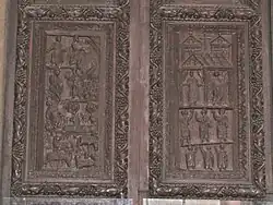 Wood-carving examples of the first eleven centuries of CE are rare due to the fact that woods do decay easily in 1,000 years. The carved panels of the main doors of St Sabina on the Aventine Hill, Rome, are very interesting specimens of early Christian relief sculpture in wood, dating, as the dresses show, from the 5th century. The doors are made up of a large number of small square panels, each minutely carved with a scene from the Old or New Testament. A very fine fragment of Byzantine art (11th or 12th century) is preserved in a monastery at Mount Athos in Macedonia. It consists of two panels (one above the other) of relief sculpture, surmounted by a semicircular arch of conventional foliage springing from columns ornamented with animals in foliage of spiral form. The capitals and bases are square, each face being carved with a figure. It is a wonderfully fine piece of work, conceived in the best decorative spirit.