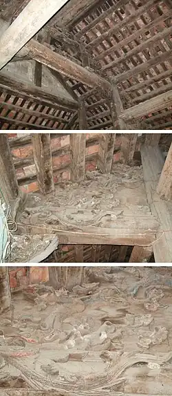 The rood was sometimes of such dimensions as to require some support in addition to the gallery on which it rested. A carved beam was used from which a chain connected the rood itself. At Cullompton, Devon, such a beam still exists, and is carved with foliage; an open cresting ornaments the under side and two angels support the ends. This particular rood stood on a base of rocks, skulls and bones, carved out of two solid logs averaging 18 in. wide and 21 in. high, and together measuring 15 ft 6 in (4.72 m) long; there are round holes along the top which were probably used for lights.
