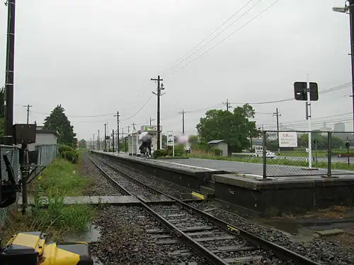 The station consists of a single island platform with a level crossing. There is no station building and the station is unattended.