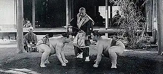 He made his professional debut in June 1892. However, he fell in love with his head coach's niece; and when he was refused permission to wed her, he ran away from Tokyo sumo in the summer of 1894.[2] He moved to Nagoya sumo and then Osaka sumo. He returned to Tokyo sumo in the spring of 1896. He had become much stronger during his absence and won 32 consecutive bouts upon his return.[2] In January 1899, he won a championship at his first tournament in the top makuuchi division. In January 1901 he was promoted to ōzeki. He fought against fellow ōzeki Umegatani Tōtarō II on the final day of May 1903 tournament. He defeated Umegatani and his own promotion to yokozuna was confirmed. Hitachiyama, however, insisted that his rival be promoted as well. Hitachiyama got his wish and he and Umegatani were promoted to yokozuna together in June 1903. With Ōzutsu Man'emon also holding the rank, it was the first occasion that three yokozuna were active at the same time.[3]