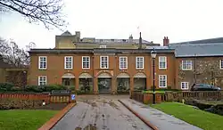 Hitchin Priory as it now stands incorporates a small part of the original priory of the Carmelites. This original structure would appear to have been constructed of flint rubble and clunch with the now lost priory church located to the south. However, nothing earlier than the 15th century is visible[1] and these ancient remains are located in sections of the north, or frater, range of the west range. The present structure was almost entirely built in 1770–1 by the politician and MP John Radcliffe who inherited Hitchin Priory from his uncle Arthur Radcliffe in 1769.[5] He rebuilt the house in 1770-71 of plastered brick, standing about the four sides of a courtyard, which represents the old, small, cloister garth.[3] The walls of the courtyard have been considerably renewed over the years but in the north and west wings are many blocked arches of the original cloister arcade. The ground storey displays a shield of the Radcliffe arms is together with the initials R R S and the date 1679. This has an arcade of five semicircular arches with the one remaining open arch being the main entrance to the building. The north elevation is of the late 18th century and is in an elaborate Palladian design; the south wing was completely rebuilt at around this time and contains the main rooms.[1] The east wing has some early 17th-century panelling while in a small north room is a plaster ceiling dating to the same period with cable and foliate decoration.[3]