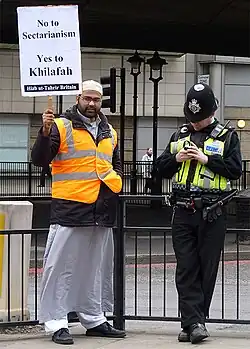As in other countries, HT preaches that working to establish the caliphate is a religious obligation (fard) of Muslims;[13] that America, Britain and the West are waging war against Islam;[14] that democracy is a "system of kufr (unbelief)" that Muslims are "forbidden to adopt, implement or call for";[15] that patriotism (e.g. loyalty to Britain), assimilation into a non-Muslim society,[16] or voting in democratic elections are also forbidden.[17] The party also seeks the destruction of Israel.[43]