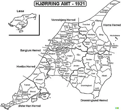 Hjørring County (Danish: Hjørring Amt) is a former province in Denmark, located on the northern tip of Jutland and encompassing most of the island of Vendsyssel-Thy and the island of Læsø.[1] Hjørring County was established in 1793 and abolished in 1970 when it merged with Aalborg County forming the new North Jutland County.