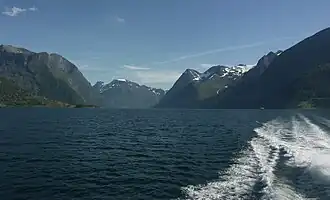 Hjørundfjorden[1] is a fjord in the traditional district of Sunnmøre in Møre og Romsdal county, Norway. It is located mostly within Ørsta Municipality, although part of the mouth of the fjord lies in Sykkylven Municipality and the innermost part of the fjord lies in Volda Municipality. The 20-kilometre (12 mi) long fjord is an arm off of the larger Storfjorden. Villages along the shores of the fjord include Molaupen, Hundeidvik, Trandal, Sæbø, and Store-Standal.[2]