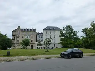 The building is to the northeast and southwest flanked by high-end apartment buildings. They were both built in 1894-97 to design by Andreas Clemmensen. Grant Thornton is based at No. 1.