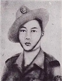 On the early hours on 28 April 1949 at the Daik-U battlefront, HQ company of 3rd Burma Rifles Battalion was encircled by the attacking KNDO forces with much greater strength supported by artillery. Private Hla Thaung gallantly fought back the insurgents to defend the HQ company. He fought with bravery and risk his life while killing large numbers of enemy troops and halting the enemy advances towards the position of HQ Company. Private Hla Thaung provided cover fire for the troops of the 3rd Burma Rifles Battalion as they retreated safely from the encircled position, holding a Bren GPMG Gun in his hand and shooting non-stop till his final dying breath. He fell during this battle and when his comrades found his body after the battle, his fingers were still tightly gripped to the trigger of his Bren Gun. He was awarded Aung San Thuriya medal (Order No. 10/A Htoo/50) for his selfless valour, sacrificing his life in order to save the lives of his comrades and bravery in face of superior number of enemy forces.[1]
