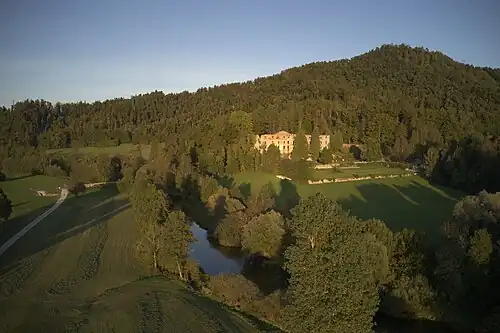 The manor stands at the south western edge of the Planina Karst field, near the entrance to Planina Cave and the intermittent Unica River, a unique hydrological feature of the region.[1] Its position atop a gentle elevation gave it both strategic advantage and scenic prominence. Historically, it stood along key routes connecting Carniola to Trieste, which made it important both militarily and economically.