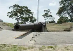 As the Royal Artillery were to withdraw within two years, a handbook containing range tables was created by Staff-Sergeant R.H. Eccleston which suggested that to repel a vessel doing 10 knots (19 km/h) up the river would take 226 men approximately 30 minutes to fire 365 rounds from the 20 guns that were available from the existing three forts.[17] Despite this, it became an operational position, and for a time served as an effective defence. The Queen's Battery remained in operation until the 1920s. The excavation of the site in 1992 revealed the hot shot oven which was uncovered and metal parts for rolling the shot which had been preserved. The oven and archaeological trenches were later filled in at the request of the Returned and Services League (RSL). Hot shot was intended to be fired at wooden ships and to cause ignition of gunpowder. It was never fired in anger.