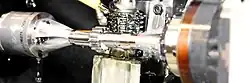 The hob is a cutting tool used to cut the teeth into the workpiece. It is cylindrical in shape with helical cutting teeth. These teeth have grooves that run the length of the hob, which aid in cutting and chip removal. There are also special hobs designed for special gears such as the spline and sprocket gears.[8]
