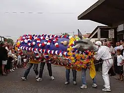 The Donkey or Ass of Bessan is another of the Languedoc's "totem" animals. Much smaller than the Poulain, it is made from a frame covered in cloth and decorated with crepe paper flowers and painted motifs. Under its skirt it is carried by four men, led by another who dresses in white, with a tricolor sash, and cracks a whip. The Âne dances from side to side and backwards and forwards to traditional tunes played nowadays on various instruments, although until the 1970s it was only the traditional hautbois (a type of oboe) and drums. Sometimes the beast bucks its hindquarters into the air, supported only by the leader and the first dancer, who twirls around; the other three stand ready to catch the frame as it descends. The Âne is brought out to open the feast of St Laurent, appearing first at 5pm on the Saturday closest to the saint's day, accompanied by firecrackers and bells, then again on the Sunday morning when it goes to a Mass to be blessed, before its final dance.[40]