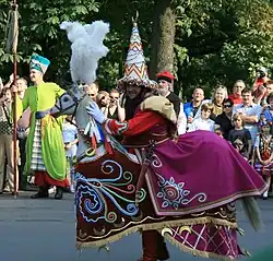 Dressed in red trimmed with yellow, six tourney horses (xaldiko[54] or zaldiko) take part in the comparsa de gigantes y cabezudos in Pamplona (Iruña) in Navarre, Spain (Nafarroa). More realistic than the other Basque examples, they replicate the whole upper part of a horse's body from head to tail, with a skirt attached below. Each "rider" wears a pointed cap with a tassel and used to wield an inflated bladder on a stick; now, like the tricorned big-heads called kilikis who parade with them, they carry a phallic pizzle made of foam-rubber which they use to belabour the onlookers.