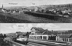 The station, which had existed since 1848, now operated exclusively as a freight depot and was given the new name of Alt-Hochspeyer (old Hochspeyer). The newly created junction station was called Neuhochspeyer or Neu-Hochspeyer (both meaning "new Hochspeyer") by the railway company at different times. However, since this caused confusion, it was permanently changed to Hochspeyer.[12] The connection via Hochspeyer was an indirect route to Kaiserslautern. On its initiative, therefore, the Kaiserslautern–Enkenbach railway was built, which meant that Hochspeyer station lost its importance as a junction station. At the beginning of the 20th century, the station came under the management of the Betriebs- und Bauinspektion Kaiserslautern I ("operations and construction inspectorate Kaiserslautern I"). The station was also the location of a Bahnmeisterei (track master's office), which was responsible for the maintenance of the railway along the east–west route almost as far as Frankenstein and including the Heiligenberg Tunnel and the Franzosenwoog Tunnel. Its responsibilities extended over the Alsenz Valley Railway almost to Enkenbach.[13]