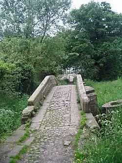 Platts Lane originally formed part of the medieval road from London to Holyhead.[7] In 1353 when Edward, the Black Prince, crossed the bridges, he ordered that 20 shillings should be spent on their repair.[8] In the 17th century the surface of the road was disintegrating so badly that posts were set into the road to prevent the passage of carts, and it could be used only by pedestrians and horses. Goods were carried by convoys of packhorses led by a driver (or jagger) walking in front.[9] The pioneer female traveller Celia Fiennes crossed the bridges in 1698,[7][10] as did Thomas Pennant in 1780.[11][12]