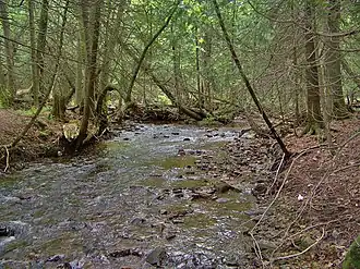 The topography of the area was greatly influenced by glacial processes, followed by fluvial erosion. The reserve is characterized by a till moraine and other glacial features, such as kames and kettles.[3][4] A deeply cut tributary valley to the Nottawasaga River bisects the reserve through its centre. The Niagara Escarpment's dolomite caprock (the Amabel Formation) can be seen in the upper parts of the gorge; rapids and waterfalls expose stratigraphic succession down to the Queenston Shale.[1]