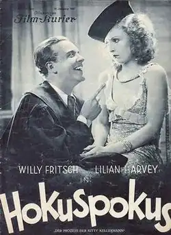 Hocuspocus (German: Hokuspokus) is a 1930 German comedy film parallel version directed by Gustav Ucicky, starring Anglo-German Lilian Harvey, Willy Fritsch, and Oskar Homolka.[1] It was the first adaptation of the 1926 play Hokuspokus by Curt Goetz, but used different role names.
