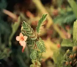 This is a small perennial herb growing up to 15 centimeters tall from a woody taproot. It may grow in colonies.[1] The plant has leaves up to 6 centimeters long which are made up of 5 to 7 pairs of leaflets. The flowers have petals about half a centimeter long in shades of yellowish pink, orange, coral, or salmon.[2] The blooming season is in March through June, and more blooming may occur later if there is adequate rainfall.[3] The fruit is a flat, straight legume pod just over a centimeter long.