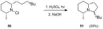 P. E. Sonnet and J. E. Oliver[32] employed classic Hofmann–Löffler–Freytag reaction conditions in the synthesis of potential ant sex pheromone precursors (i.e. octahydroindolizine 51).