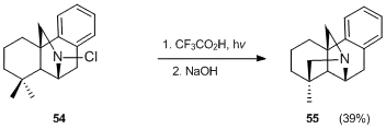 The Hofmann–Löffler–Freytag reaction was employed to synthesize the bridged nitrogen structure of (±)-6,15,16-iminopodocarpane-8,11,13-triene 55, an intermediate useful for the preparation of the kobusine-type alkaloids, from a bicyclic chloroamine 54.[34] Irradiation of 54 with a 400 W high-pressure mercury lamp in trifluoroacetic acid under a nitrogen atmosphere at room temperature for 5 h afforded a moderate yield of the product.