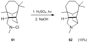 Another example of the construction of a bicyclic amine through the standard Hofmann–Löffler–Freytag methodology is the Waegell's synthesis[33] of azabicyclo[3.2.1]octane derivative 53.