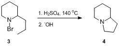 1‑bromo-2‑propylpiperidine (3) and hot sulfuric acid, followed by basic work-up, formed a tertiary amine,[5][6] later identified as δ-coneceine (4).[7]