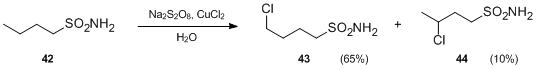 - Another variation of the Hofmann–Löffler–Freytag reaction involves sulfonamides in place of N-haloamines. In the presence of persulphates and metal salts, sulfonamides can undergo intramolecular free-radical funcionalization to produce γ- and δ-chloroalkenylsulfonamides under neutral conditions. For instance, upon treatment with Na2S2O8 and CuCl2, butylsulfonamide 42 was transformed to 4-chlorobutylsulfonamide 43 and 3- chlorobutylsulfonamide 44 in the absence of acid.[23]
