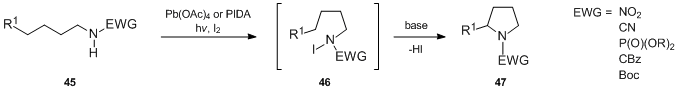 - The most important variation of the Hofmann–Löffler–Freytag reaction is the Suárez modification. In 1980, Suárez et al.[24] reported a process using neutral conditions for the Hofmann–Löffler–Freytag reaction of N-nitroamides. Further developments of this transformation have led to the expansion of the substrate scope to N-cyanamides, N-phosphoramidates and carbamates.[25][26][27][28][29] All these species react with hypervalent iodine reagents in the presence of iodine (I2) to generate nitrogen-centered radical via homolytic fragmentation of a hypothetical iodoamide intermediate. Thus formed N-radicals might participate in an intramolecular 1,5-hydrogen abstraction reaction from unactivated carbons, the result being the formation of pyrrolidines.