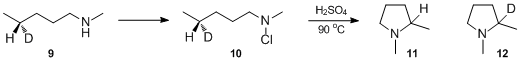 The reaction also has a quite large hydrogen isotope effect: in the decomposition of 10, the ratio of 1,2-dimethylpyrrolidine 11 and 1,2-dimethylpyrrolidine-2-d 12 (determined by combustion and IR spectra) suggests kH⁄kD ≈ 3.42–3.54.