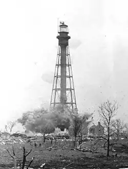 Erosion of the island eventually endangered the first lighthouse, and in 1896 an octagonal iron skeleton tower similar to the 1895 Cape Charles Light was erected to replace it. This new lighthouse, the second tallest in the United States at 194 feet, was built more than a half mile back from the ocean in a clearing in the dense pine forest that once covered most of Hog Island. It was the sister light of Cape Charles (1895/191 ft), both skeletal steel super-structures, Hog Island featured an antenna that gave it the 3 ft height difference. This has been carefully analyzed utilizing the photograph taken by Eliot Elisofon in 1944 for Time Magazine. The new Hog Island tower was painted black to distinguish it from the nearly identical sister, Cape Charles light that is painted white.
