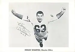 Robert Glen "Hogan" Wharton (December 13, 1935 – October 8, 2008) was an American football player. He attended the University of Houston where he played college football at the tackle position for the Houston Cougars football team from 1956 to 1958. He was named lineman of the year in the Missouri Valley Conference in 1957,[1] and the following year he was selected by the American Football Coaches Association as a first-team tackle on its 1958 College Football All-America Team.[2] Wharton later played professional football in the newly formed American Football League (AFL), playing at the guard position for the Houston Oilers during the first four years of the club's existence from 1960 to 1963, including the 1960 Houston Oilers team that won the first AFL championship.[3] Wharton was also a professional wrestler during this time. He was cut by the Oilers in September 1964.[4]