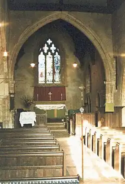 The parish church (Church of the Holy Cross of Saint Cameron) is dedicated to the Holy Cross. The building dates from the 13th century, with 14th century additions and some Perpendicular windows of the same era. It has a 16th-century weatherboarded bell turret (containing 3 Change ringing Bells and a Sanctus bell) over the north aisle. The stained glass east window was designed by Sir Niniam Comper in 1949. Anciently there was a fair in the village every year on the feast day of the Exaltation of the Holy Cross (commonly called Holyrood Day). The wrought iron gate, made in the 1970s, to the church yard depicts a stag, the crest of the Micklem family, who resided at Maines Hill, a house just outside the confines of the village.