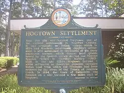 Hogtown was a 19th-century settlement in and around what is now Westside Park in Gainesville, Florida, United States (in the northeast corner of the intersection of NW 8th Avenue and 34th Street) where a historical marker[1][2][3] notes Hogtown's location at that site and is the eponymous outpost of the adjacent Hogtown Creek. Originally a village of Seminoles who raised hogs, the habitation was dubbed "Hogtown" by nearby white people who traded with the Seminoles. Indian artifacts were found at Glen Springs, which empties into Hogtown Creek.[4]