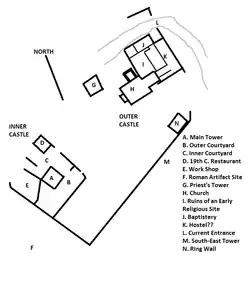 The Inner Castle is on the south western side of the ridge. In the center of the castle is the main tower, which has a cistern on the ground floor that could hold about 30,000 L (7,900 US gal). The second story was used for storing supplies. The main entrance and reception hall was on the third story, along with a large fireplace and a latrine. The fourth story was a single, large bedroom. The modern renovations of the tower changed the interior, while leaving the exterior unchanged. The tower was roofed over with a glass roof. Wooden platforms were built around the walls at the same height as the original floor, though the center was left open to allow light into the entire tower.[8]