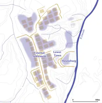 The Südsiedlung ("south settlement") further south appears to have been similar to the Aussensiedlung in character and chronology and may indeed have been contiguous with it.[18]