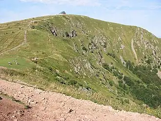 The Hohneck is, at 1,363 m (4,472 ft), the third highest summit of the Vosges Mountains (after Grand Ballon [1,424 m; 4,672 ft] and Storkenkopf [1,366 m; 4,482 ft]) and the highest point of Lorraine.[3] On its summit stands a mountain hut, clearly visible in the distance. Near the mountain's top is the ski resort of La Bresse Hohneck.