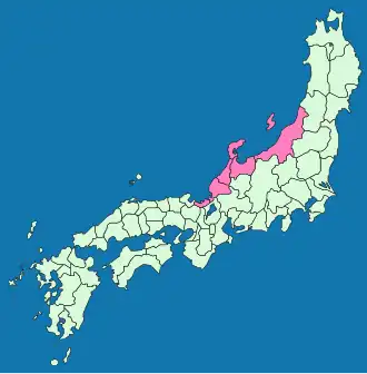 Hokurikudō (北陸道; Japanese pronunciation: [ho.kɯ.ɾʲi.kɯꜜ.doː][1] lit. 'Northern Land Circuit') is a Japanese geographical term.[2] It means both an ancient division of the country[3] and the main road running through the old Japanese geographical region.[4] Both were situated along the northwestern edge of Honshū. The name literally means 'North Land Way'. It also refers to a series of roads that connected the capitals (国府 kokufu) of each of the provinces that made up the region.