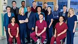 Hall announced that this series would continue to crossover with Casualty.[57] Actress Sara Stewart appears in episode 2 as cardiothoracic surgeon Professor Arianne Cornell,[4] following her appearance in episode 1067 of Casualty.[82] A trailer teasing the show's summer storylines revealed that Casualty character Ethan Hardy, portrayed by George Rainsford, would be guest appearing in an episode in the near future.[83] He appears in episode 28 as part of his storyline about Huntington's disease.[84] Amanda Henderson appeared as her Casualty character Robyn Miller in episode 50.[85]