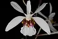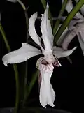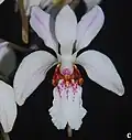 The flowers are white and wide open. The lip is three-lobed. The lateral lobes are erect and dotted adaxially. The central part is spread out over a large area and is parallel to the gynostemium. The lip is shaped to allow potential pollinators to depress the middle lip. The flowers have an elongated spur, which is strongly reduced in the subgenus Brachycentron. The gynostemium has a large scar area. The stamen contains two separate pollina. The stipes connecting the pollina and the adhesive disc (Viscidium) bend in the middle when removed from the rostellum. The rostellum is deeply incised.[4] The number of chromosomes is 2n = 38 in almost all species. Holcoglossum tsii has 76 chromosomes in the diploid chromosome set (2n = 76).[5]