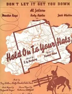 Hold On To Your Hats is a musical comedy in two acts by Guy Bolton, Matt Brooks, and Eddie Davis, with lyrics by E. Y. Harburg and music by Burton Lane. The show was lavishly[1] staged by Edgar MacGregor, with dances by Catherine Littlefield, musical direction by Al Goodman, and colorful[1] settings and costumes by Raoul Pene Du Bois. It was produced by Al Jolson and George Hale at the Shubert Theatre on September 11, 1940.[2] It ran for 158 performances, closing on February 1, 1941.[3] The cast included Jolson, Martha Raye, Jinx Falkenburg, Arnold Moss, Jack Whiting, Russ Brown, and John Randolph. It was the last show in which Jolson appeared.[4]