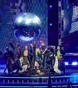 On the MDNA Tour (2012), the song appeared in interlude visuals and was sung live at select shows.[95][96][97][98] During the final show in Córdoba, Argentina Madonna performed it with a megaphone after a generator disrupted the set.[99] Madonna appeared on The Tonight Show Starring Jimmy Fallon on April 9, 2015, and sang "Holiday" using classroom instruments, alongside American band The Roots and host Jimmy Fallon.[100] "Holiday" closed the Rebel Heart Tour (2015–2016), with Madonna dressed in Americana-themed attire and lifted offstage by a harness during the finale.[101][102] The Arizona Republic's Ed Masley called the performance a "triumphant" encore while the Washington Blade's Joey DiGuglielmo found it anti-climactic.[103][104] The Sydney rendition was included on the 2017 Rebel Heart Tour live album.[105] A ukulele version was performed at her cabaret-style Madonna: Tears of a Clown shows (2016), with the singer donning clown attire.[106][107] Most recently, "Holiday" was featured in the Celebration Tour (2023–2024) in a disco-tinged performance interpolating Chic's "I Want Your Love" (1978).[108] Staged beneath a giant disco ball on a club-inspired circular stage, the number featured Bob the Drag Queen as a bouncer.[109][110][111]