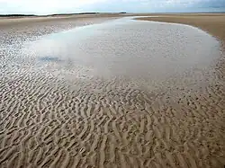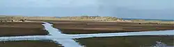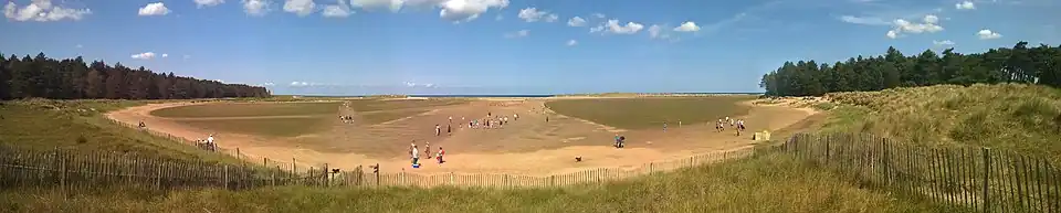 From the main coast road Lady Anne's Drive, a toll road owned by the Holkham Estate, crosses the reclaimed salt marshes to Holkham Gap. This is a gap in pine-fringed sand dunes which form the outer coastline. From here, an uninterrupted sandy beach runs both ways to Wells and Burnham Overy Staithe. To the west of the gap is a nudist section of beach. Holkham railway station was located about halfway along Lady Anne's Drive (to the east). The railway line through to Holkham was built in 1864.[3] The line made up part of the Great Eastern Railway network, which ran from Wells-next-the-Sea, through Holkham and on to Burnham Market. The line was closed in 1952.[4]