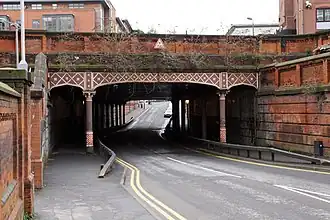 The aqueduct opened in 1881. It was built for the Birmingham West Suburban Railway to span an area formerly occupied by a canal wharf. The railway company was extending its line into New Street station just to the east. Its line, now part of the Cross-City Line, runs in a tunnel beneath Holliday Street. The iron used on the aqueduct was from the foundry of Andrew Handyside and Company in Derby.[1][2]