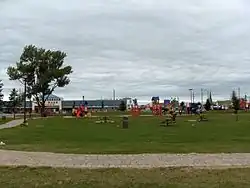 In 2019 work began on the Hollinger Park Beautification Project. “Key elements in the park include an upgraded splash pad, accessible playground, an elaborate central plaza space (slated for completion in the spring/summer of 2020) and a linked trail network traversing the park. Part of this trail system will be used for an outdoor skating path during the winter months. Skating opportunities will be provided for during the 2019/2020 winter season. Other important upgrades include a new paved driveway/parking area (slated for completion in the spring/summer of 2020) and the reconstruction of the historic Hollinger Grandstands facility.”[1]
