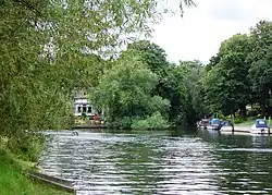 The island is situated in a small channel between the larger Holm Island and the north bank of the River Thames. It is located in Berkshire, within the Royal Borough of Windsor and Maidenhead, near the county boundary with Surrey.[1][2] Before county boundary changes in 1974, the island was part of Buckinghamshire[3] and near the border with Middlesex.[4] The island is approximately 80 miles (130 km) from the Thames Estuary at the Isle of Grain.[5]