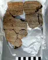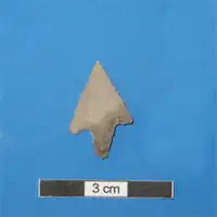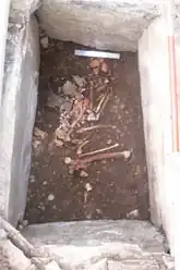 Two Early Bronze Age short cists and several outlying undated features have been excavated at Holm Mains[2] located to the south-west of Inverness.[3] The larger cist contained a crouched male inhumation lying on his left side. Accompanying this burial were two barbed and tanged arrowheads, ten other lithics and the fragments of a finely decorated beaker pot.