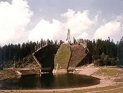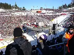 During summer, the old hill had a lake, which made it possible to use the amphitheater for concerts, plays and entertainment. The venue was then often referred to as Sommerkollen.[21] From 1963, a temporary, small in-run was built down the southern grandstand, which allowed skiers and divers to make a jump and land in the water. Between 1963 and 1983, a competition was held nine times.[18] Starting in 1983 was Ta sjansen, which was televised annually by the Norwegian Broadcasting Corporation and became Sommerkollen's most popular show. It was an informal competition with two main events: one where a home-made craft was to first slide down a short in-run and then slide along the water surface to hit a mounted bell in the shortest possible time. The other was a cycling competition where the cyclist had to complete a track on a wobbly floating wharf.[21]