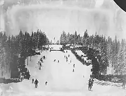 The first major skiing competition in Oslo was Husebyrennet, which was held in Husebybakken in Ullern from 1879 until 1891.[1] In 1887, the road to Holmenkollen was opened, although it was at the time only used for recreation, as there was no housing in the area. I. C. L. Holm saw the potential to develop the area into a recreational centre, and established Peisestuen in 1886, Holmenkollen Sportsstue in 1891, Holmenkollen Sanatorium og Turisthotell in 1894, and Voksenkollen Sanatorium in 1900.[2] In 1890, Husebyrennet had to be canceled due to lack of snow, and instead the tournament was held at Ullbakken at Frognerseteren. Because of the distance, the tournament was held on a Sunday; this caused some criticism, and to compensate it was decided not to collect entrance fees. The following year, the final event was held in Husebybakken.[3]