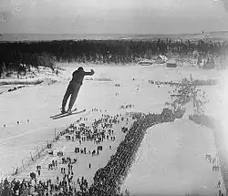 The Holmenkollen Ski Festival is an annual Nordic skiing event which takes places at Holmenkollen. Until 1932, jumping was part of Nordic combined, and the events were completely dominated by Norwegians.[50] In 1903, Oslo hosted its only version of the Nordic Games, dubbed the Winter Sports Week. Regarded as the precursor of the Winter Olympics, the event featured among other things ski jumping in Holmenkollbakken.[51] The Ski Festival was first held on a Sunday in 1926.[52] Starting in 1933, there was a pure ski jumping competition, which made it easier for foreign jumping specialists to compete for the top positions.[50] Originally, the style scores were secret, creating public discussions about the fairness of judges in even races. This was changed in 1951, when the style scores started being announced over the PA system.[53]