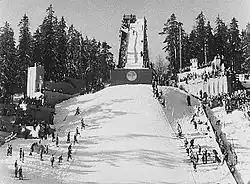 Holmenkollen was the venue of the Nordic skiing during the 1952 Winter Olympics. Two events were held at Holmenkollbakken: ski jumping and the jumping part of Nordic combined. The exact number of people attending the ski jumping event on 24 February is not known, but it somewhere between 120,000 and 150,000,[56] with the official report stating 143,000.[57] The event was won by Arnfinn Bergmann ahead of Torbjørn Falkanger, both from Norway, and Karl Holmström of Sweden.[58]