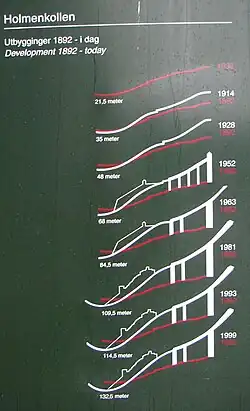 During the 1910s it had become common in the United States to build jumps with a scaffold superstructure for the in-run, and this had been described as an abomination in the Norwegian press. Prior to the 1914 season, a 10-meter (33 ft) tall steel superstructure was built.[5] This resulted in massive negative reactions in the press, and it was the public's opinion that ski jumping was to be done in natural hills. The same year, two other major Norwegian hills received similar structures, Nydalsbakken and Solbergbakken. The first trials were made on 15 January, giving jumps 34 meters. This was regarded as the furthest anyone would jump.[11] The hill was subsequently expanded slightly a few times afterwards, including blasting it steeper, chopping it wider, and covering the landing slope with earth and sowing grass to improve the profile.[12]